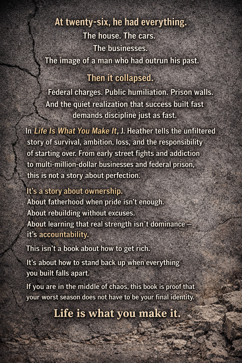Life Is What You Make It is powerful reminder that no matter how far you fall you can rise again. Through struggle, loss, and hard-earned lessons, this story challenges you to take control, rebuild stronger, and become who you were meant to be.
